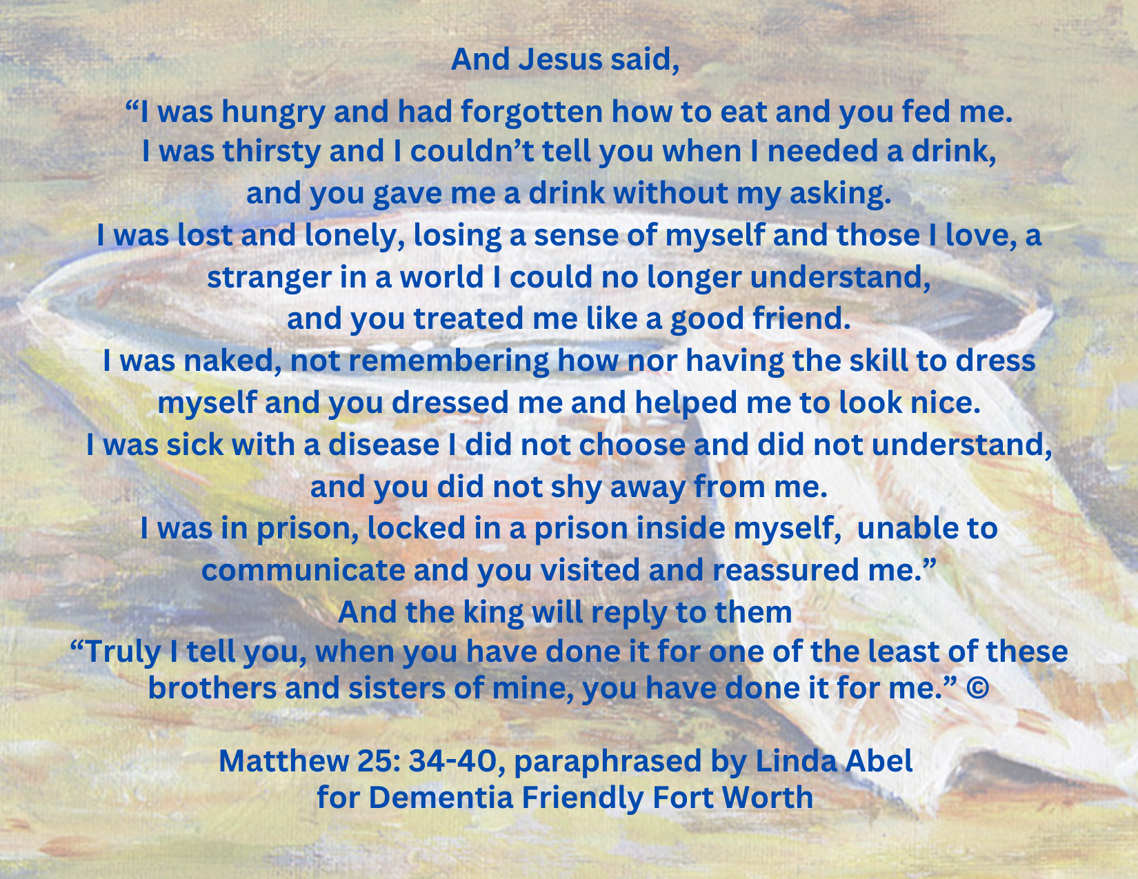 Linda Abel was instrumental in the founding of Dementia Friendly Fort Worth at the leading and direction of God. Matthew25Jewelry is the next step in the journey to follow God’s leading and serve persons living with dementia and their families. This, too, is at the inspiration and leading of God.